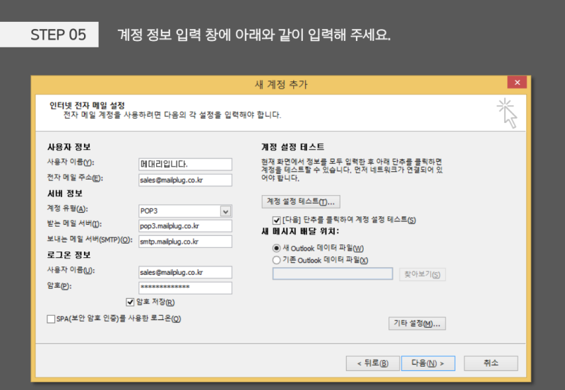 STEP 05_다시 계정 설정 창으로 돌아와 [다음] 버튼을 클릭한 뒤, 테스트 후 연동을 완료합니다.