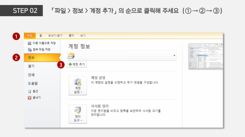 STEP 01_아웃룩을 실행하신 뒤, 정보 > 계정 정보 > 계정 설정(또는 추가)을 클릭해주세요.