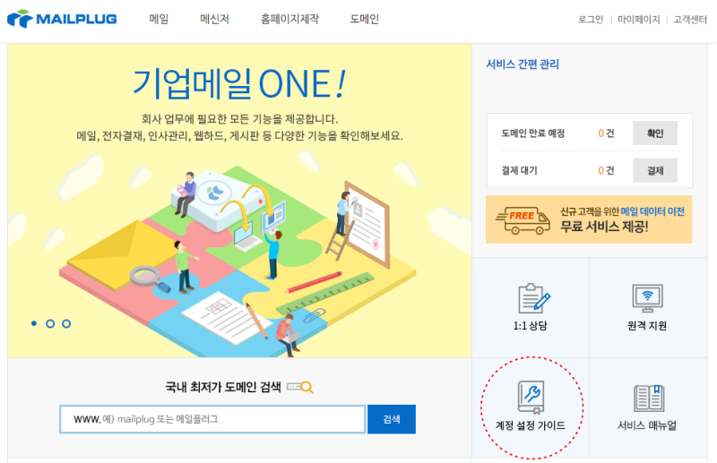 메일플러그 홈페이지에 접속하여, 우측 [계정 설정 가이드] 아이콘을 클릭합니다.