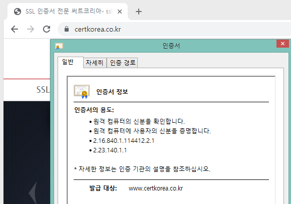 - 서버 브라우저 및 외부망 브라우저에서 https://도메인:SSL포트 로 접속, 인증서 정보를 확인합니다.